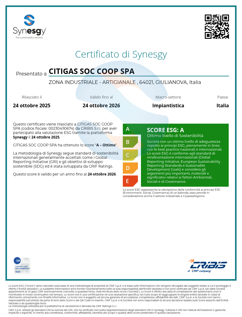 Ragione sociale: CITIGAS Società Cooperativa S.p.A., Indirizzo sede legale: GIULIANOVA (TE), 64021, Zona Ind.le Colleranesco, SNC, numero REA: TE 68-115, Registro delle imprese di Camera di Commercio GRAN SASSO D’ITALIA, PEC coop.citigas@citigas.it. Capitale sociale: Euro 390.217 Capitale versato: Euro 376.760